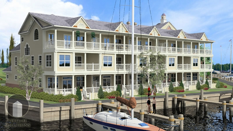 Rising on the banks of Cambridge Creek, from the Choptank river in the city of Cambridge on Maryland’s Eastern shore, is Sturbridge Homes latest condominium community waterside. ADW was commissioned by a repeat client/developer, who purchased a dilapidated boat repair facility on the creek. ADW not knowing Cambridge’s regulations as intimately, immersed themselves in the city’s “waterfront promenade” districts requirements, and local architecture.